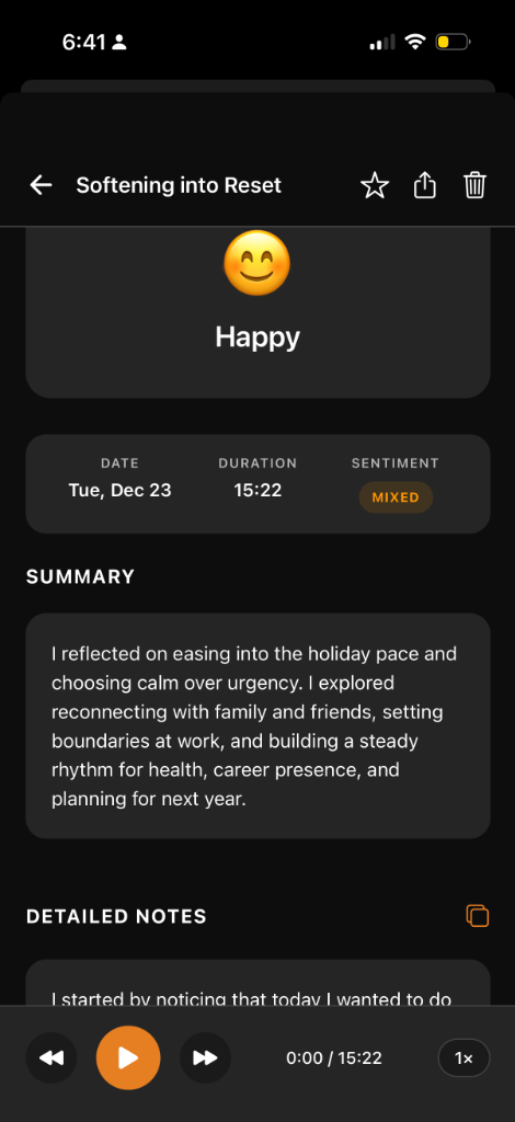 Every journal gets an AI-powered summary, sentiment analysis, and detailed notes. Replay your audio anytime while reading the full context of your thoughts.
